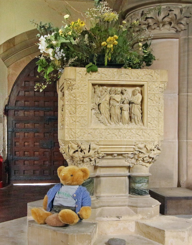 Also, this St Mary’s was open for me to look around. It has a wonderful square font with carving on three sides (and a big vase of flowers on the top, making it unavailable for sitting purposes).